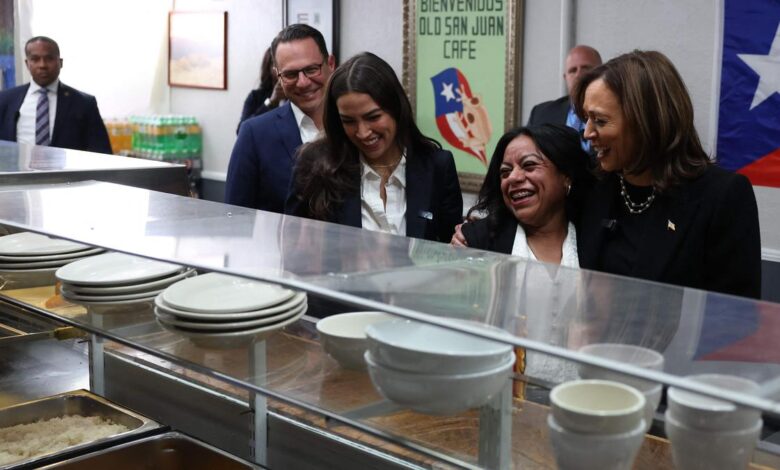US Vice President and Democratic presidential candidate Kamala Harris (R) speaks with restaurant owner Diana de la Rosa (2nd R) as Pennsylvania Governor Josh Shapiro (L), and US Representative Alexandria Ocasio Cortez (2nd L), Democrat of New York, look on during a stop at Old San Juan Cafe as she campaigns in Reading, Pennsylvania, on November 4, 2024.